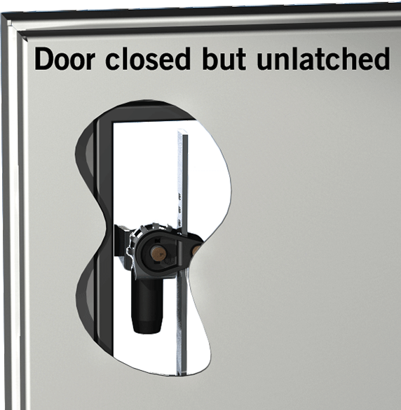 Der Verriegelungsstab befindet sich ganz unten. Rollzapfen waagrecht hinter dem Rahmen. Die Tür ist geschlossen und verriegelt. |